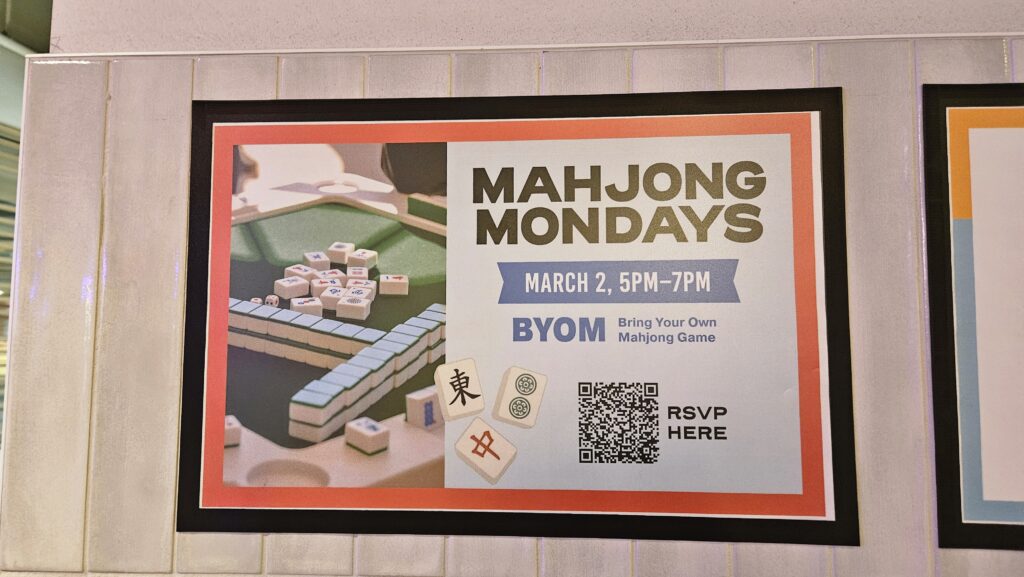 The newest addition to the local scene is Montahj Social, a pop-up mahjong studio at Ballston Exchange inside El Rey Ballston’s space, offering lessons, guided games, and reservable tables for up to two hours of play, with a food and drink menu alongside the tiles.. For a more community-oriented crowd, Arlington County’s senior and recreation centers host drop-in American-style mahjong sessions at Arlington Mill on Mondays, Thursdays, and Saturdays, and at the Madison Community Center on Tuesdays — details at parks.arlingtonva.us. And Art House 7 on Langston Boulevard offers classes, workshops, and game nights for players from 4th grade to adult. With so many options across Rosslyn, Ballston, Pentagon City, and beyond, getting a regular game going in Arlington has never been easier.