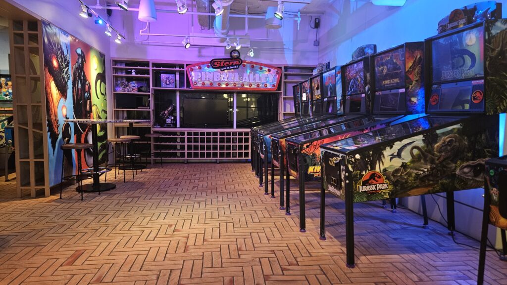 The Pinball Basement is a family-friendly arcade and event venue offering a combination of pinball, retro arcade games, classic video games like Ms. Pac-Man and Galaga, foosball, and a vintage carousel horse for the little ones. Located on the lower level of the Upside on Moore food hall at 1700 N. Moore Street, the arcade offers daily playing passes and monthly memberships — making it equally suited for a casual drop-in afternoon or a dedicated regular habit. Co-founded by pinball enthusiasts Fred Freimark and Jason Good, the arcade features themed machines including popular titles like “Jurassic Park,” “Jaws,” “Ghostbusters,” and “Iron Maiden,” and hosts a weekly Thursday pinball league.