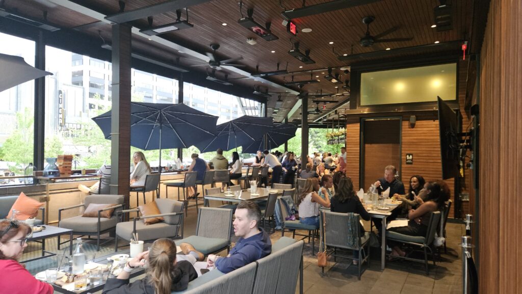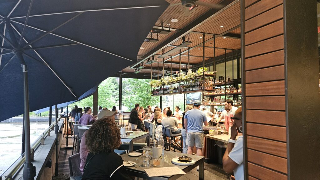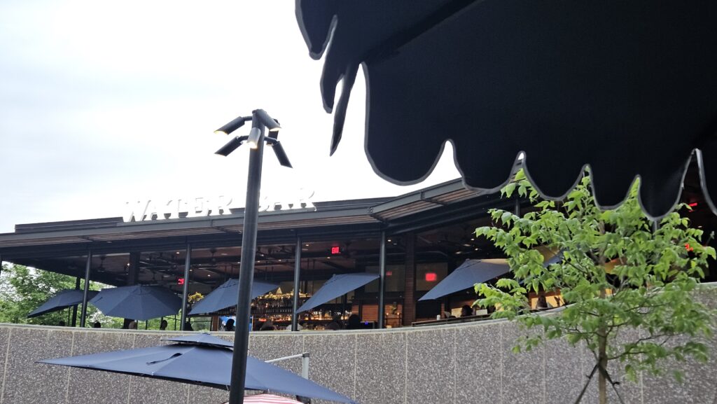 Water Bar is one of Arlington’s most distinctive dining spots — a breezy, coastal-themed restaurant and bar perched atop Water Park at 1601 Crystal Dr. in the heart of National Landing, the rapidly transforming neighborhood adjacent to Amazon’s HQ2. The open-air terrace overlooks the park’s infinity fountain and lush green space below, creating a resort-like atmosphere in the middle of an urban neighborhood. The menu focuses on fresh, locally sourced seafood in a laid-back coastal style: lobster rolls on brioche, a crawfish and shrimp dip with creole spice, beer-battered fish and chips, pan-seared salmon over parmesan risotto, and garlic prawn pasta with squid ink linguini.