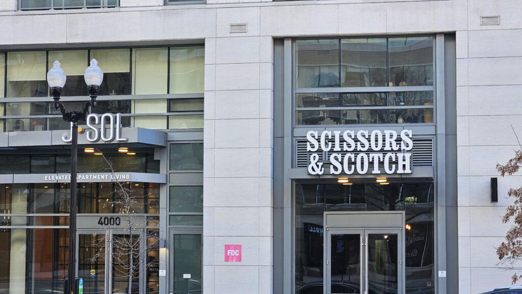 Scissors & Scotch at 4000 Fairfax Drive in Ballston has solved a problem most barbershops never thought to address: what to do while you wait. The answer, apparently, is a beautifully stocked bar lounge where every haircut comes with a complimentary cocktail, coffee, or cold beer — transforming what is typically an errand into something that actually feels like a treat. The space is warm, well-designed, and deliberately unhurried, with a private lounge area that separates the waiting and drinking experience from the cutting floor in a way that makes the whole visit feel more intentional.